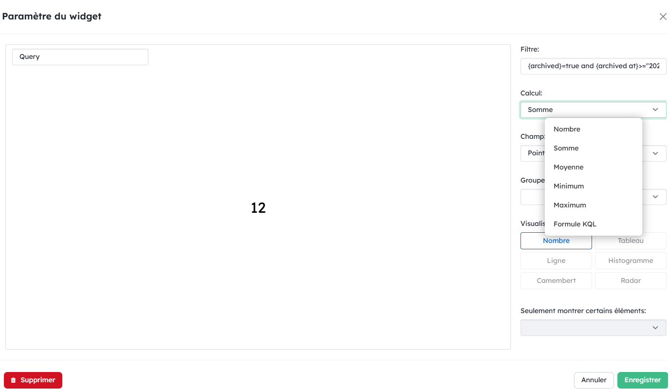 Ce widget vous permet de créer votre propre requête de filtre et de calcul.