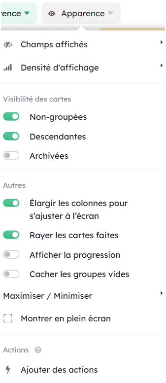 Pour les actions automatiques qui ont un déclencheur manuel. Ajoutez un bouton dans la barre d’outils de la vue pour déclencher les règles avec le déclencheur “se déclenche quand vous sélectionnez manuellement cette règle”. Pour cela, rendez vous dans Apparence puis “Ajouter des actions”