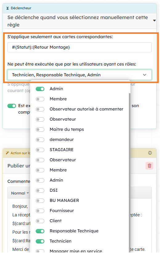 Conditions (filtre et rôle) pour pouvoir déclencher la règle via le bouton