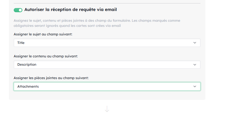 - Autoriser la réception de requête via email Votre projet est alimenté par les informations complétées via le lien de formulaire mais vous pouvez aussi autoriser la création de requête via l’adresse email associée que vous trouverez dans l’onglet “partager”. Lorsque vous activez cette option, vous devez associer au moins 1 champ de votre carte aux informations contenu dans le mail : objet du mail, contenu du mail, pièces jointes du mail.