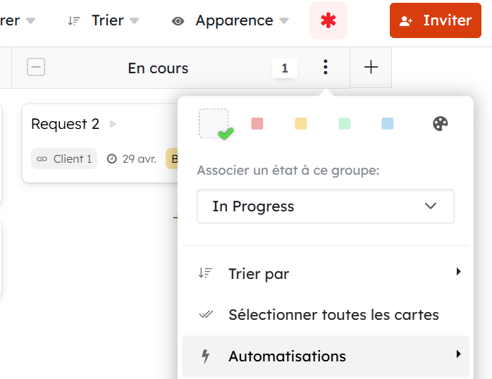 Ainsi, quand vous créez ou déposez une carte dans ce groupe, Les champs et groupes de cartes sont automatiquement définis en fonction de vos actions automatiques.