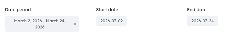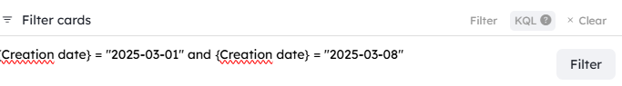To search for cards created between 01/03/2025 and 08/03/2025. If you want these dates to be inclusive, you can use >= or <=