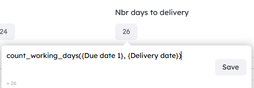 Example: get the cards which have a due date 3 days ago:{due date} <= ago("3 days")ahead(interval): returns the date in the future at the specified intervalweek_start([date]): returns the date for the first day of the week. If no parameter is provided, current week is used.week_end([date]): returns the date for the last day of the week. If no parameter is provided, current week is used.workweek_start([date]): returns the date for the first working day of the week. If no parameter is provided, current week is used.workweek_end([date]): returns the date for the last working day of the week. If no parameter is provided, current week is used.week_number([date]): returns the number of the weekmonth_start([date]): returns the date for the first day of the month. If no parameter is provided, current month is used.month_end([date]): returns the date for the last day of the month. If no parameter is provided, current month is used.month_number([date]): returns the number of the monthyear_start([date]): returns the date for the first day of the year. If no parameter is provided, current year is used.year_end([date]): returns the date for the last day of the year. If no date is provided, current year is used.year([date]): returns the yearcount_days([start], [stop]): returns the number of days between between two dates. If parameters are omitted, current month start and end dates are used.count_working_days([start], [stop]): returns the number of working days between two dates (all days except weekends). If parameters are omitted, current month start and end dates are used.last_moved_in_group_at(group_name, [type_name]): returns the date the card was last moved in the specified group (type_name is optional, it allows to specify the field or context from which an attribute is derived duplicated in the wokspace)if(expression, value, elseValue): returns value if expression is true and elseValue if expression is falseas_string(value): converts a value to a string, for instance as_string({Points})as_date(value): converts a value to a date, for instance as_date({Text field})-