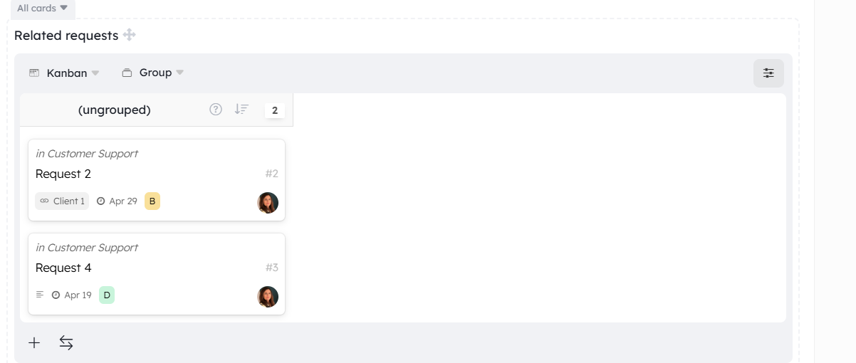 - For links created with cards from the same workspace — In addition to the view type, you will find grouping and sorting tools here.